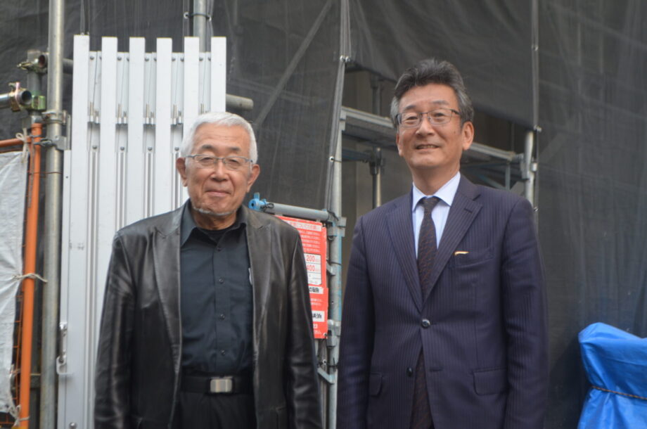 まだ養生幕のかかった現場の前で、吉羽氏(左)と西山社長