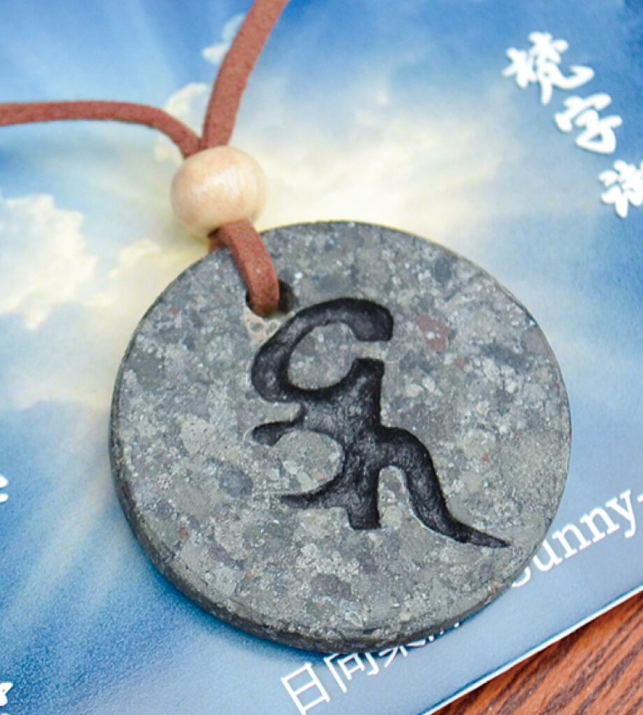 御守りは、丸く削った日向石に、サンドブラスト加工を施して薬師如来を表す梵字が彫られたもの。裏面には「日向薬師」の名前が印刷されています。文字のカットなどすべて手作業で行うため、一つひとつ仕上がりが異なることも魅力の一つになっています。