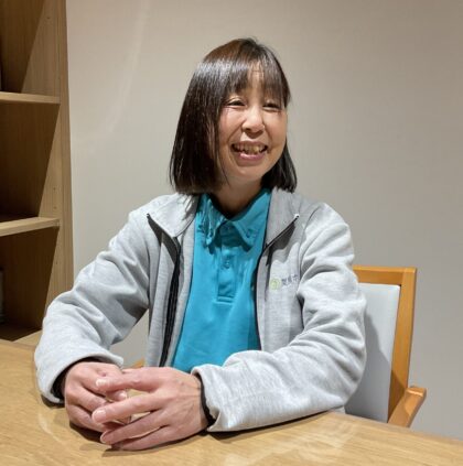 訪問介護サービス提供責任者を務める牧和江さんは、ヘルパーとして約10年、ご利用者さんの自宅を訪れ生活を支えています。元々は栗原ホームのデイサービスに携わる介護職員として約10年の経験があり、「デイサービスは集団で介護に携わる職種ですが、個別に対応する介護に興味が芽生え、ヘルパーに異動しました」と牧さんは思いを話してくれました。また、当時は子どもが小さかったので、働く時間の融通が利きやすかったのもきっかけになったといいます。