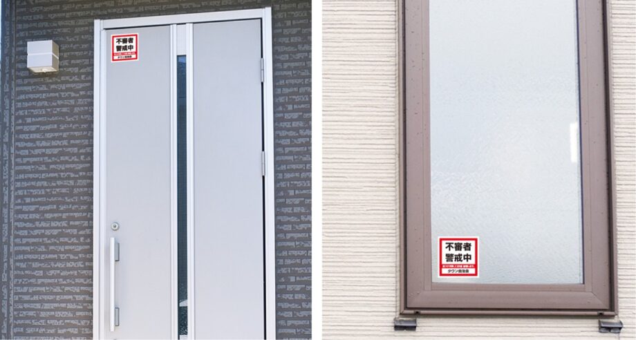 10cm×10cmサイズのステッカーには「防犯重点地区」などの警告文を、各団体の要望に合わせたオリジナルデザインで入れることが可能。ステッカーはUVラミネート加工のため紫外線や雨に強く、耐久性が高いのも魅力の一つで、自宅や建物のドア、窓など、場所を問わず貼りつけることができる。