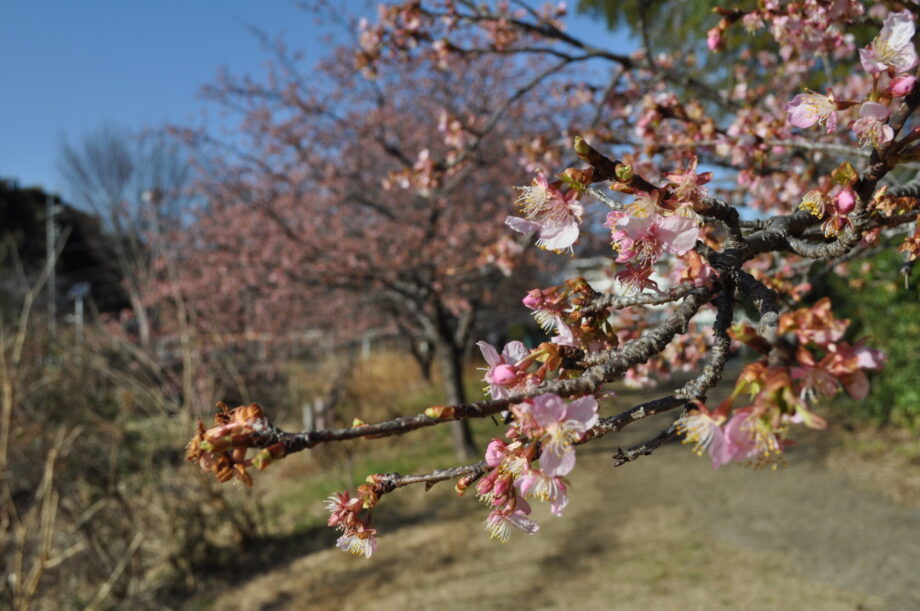 まずは「関ヶ原の水辺」。水辺に接する木の種類が豊富な場所で、河津桜も10本ほど植えられています。周辺は平たんで、観賞しやすいのもポイントです。