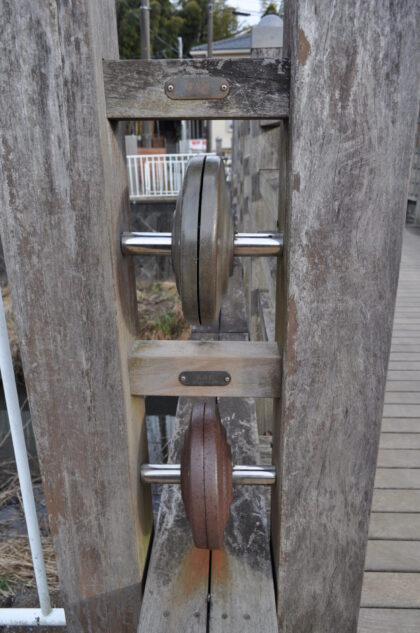さらに川を下り、「寺ノ脇の水辺」へ。ここの河津桜は、つぼみが多い印象。すぐ近くにある「赤関おとなり橋」は、回すと音が鳴る8種類の鳴り車が付いており、知る人ぞ知るスポットです。