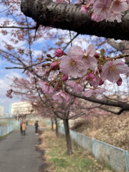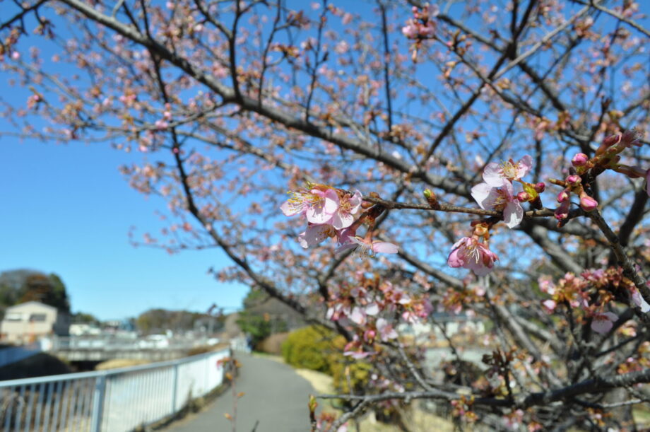 最初に向かったのは、瀬谷区の西端を流れる境川。区内の上流には、早咲きの品種「河津桜」のスポットがあります。青い空と川のせせらぎ、そして鮮やかなピンクのコントラストは、本格的な春の到来を感じさせます。細い遊歩道の入り口など、自動車では入り込めない場所までスムーズに移動でき、シェアサイクルの「小回りの良さ」を実感できます。