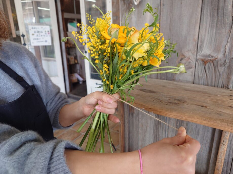 花束が形になったら、優しく束ねます。春の花は特に茎が柔らかいため、ゴムではなく麻ひもなどで、優しくまとめるのがおすすめです。