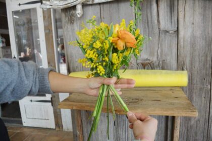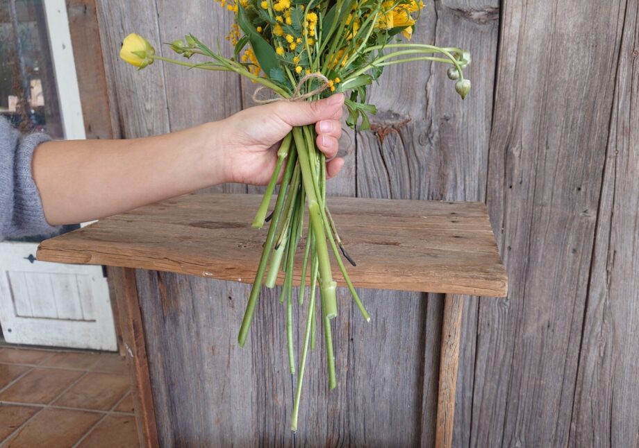 また、「さまざまな形の草花を組み込む」とより豊かな表情の花束となります。そのため、今回は小さな花を咲かせるミモザだけでなく、大きな花を咲かすものや、細長い葉物など、多様な形の草花をブーケにします。