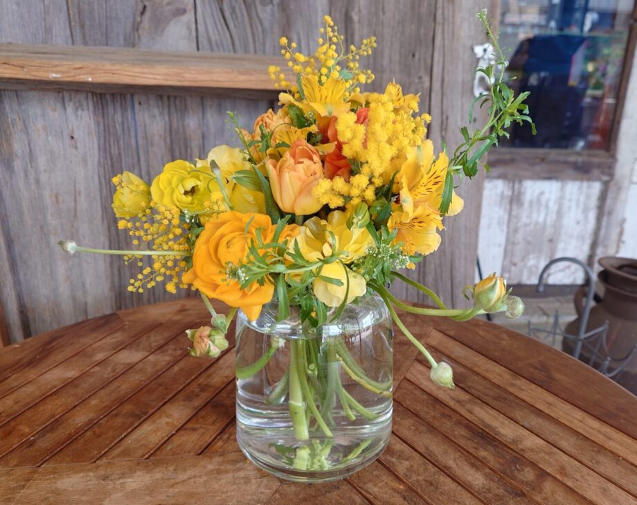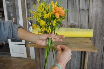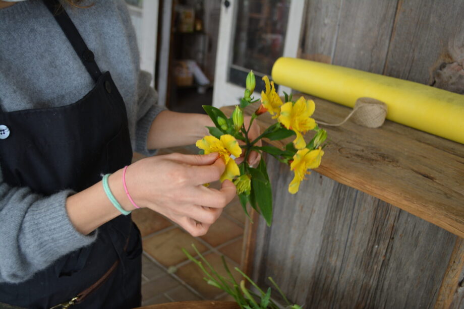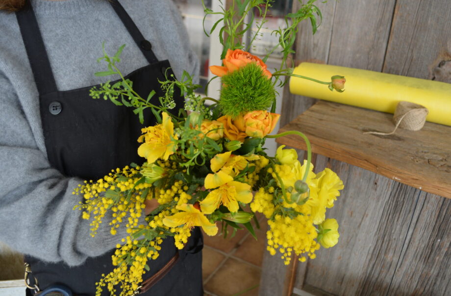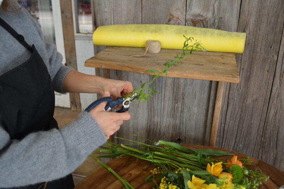 花束作りの第一歩はお花選び。今回は花うに並ぶ花の中から、春が旬のミモザをメインに据えます。次に周りを彩る花を決めますが、この時に意識すべきことは「同系色でまとめること」。脇田さんは「それぞれ違う色の好きな花でまとめるのも良いですが、同系色で統一した方が全体にまとまりが出るのでおすすめです」と教えてくれました。今回は黄色のミモザに合うように、オレンジや緑色の草花を選んでいきます。