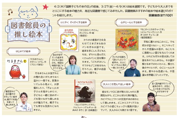 これは「図書館で出会う 絵本の魅力」をテーマに特集が掲載された「広報ちがさき 3月号」をきっかけにした企画。特集内で図書館員がおすすめした『カラスのパンやさん』『カピバラがやってきた』『だるまさんが』のほか、茅ヶ崎在住の絵本作家・垂石眞子さんの『ガオガオきょうりゅうのよる』が並んでいます。