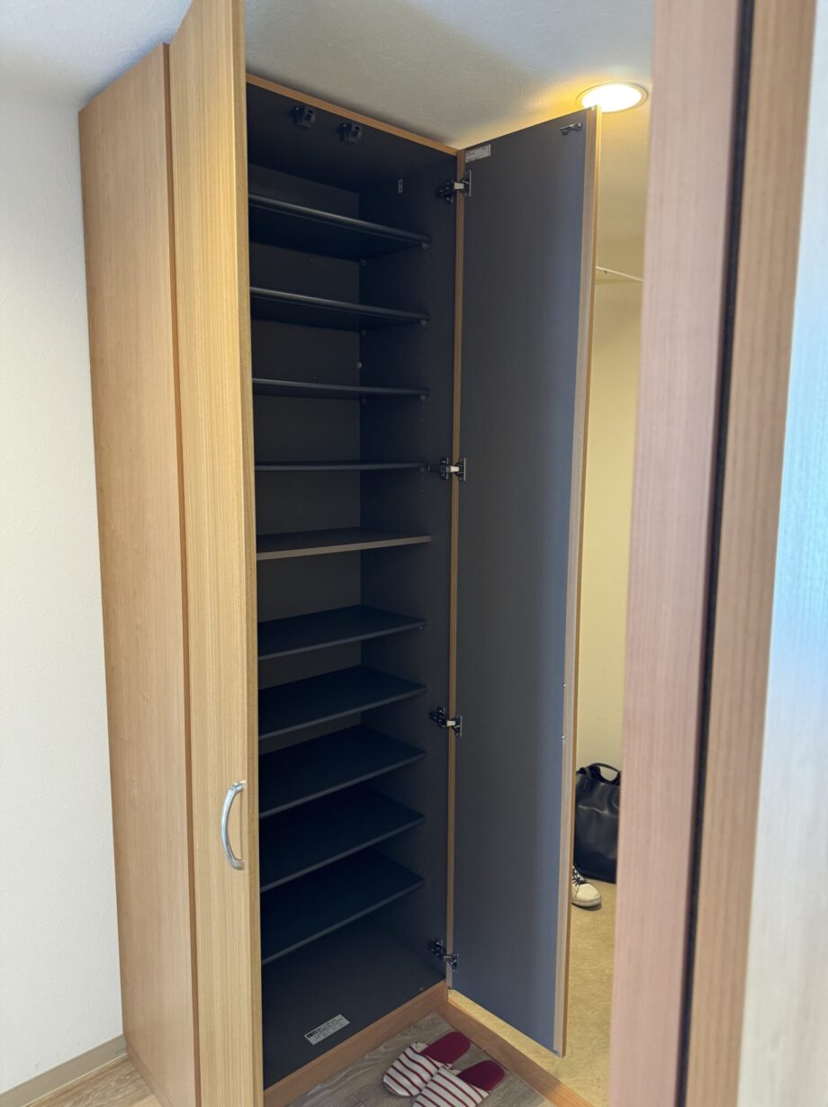 備え付けのシューズボックスは家族全員分の靴が余裕で収まるサイズ。子供の成長とともに増える靴の置き場に困ることはなさそうです。