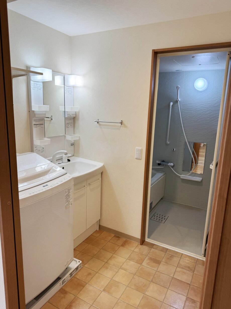 洗面脱衣所も家族で使うには十分な広さ。朝の忙しい時間帯でも、大人と子供が並んで身支度できるスペースがあります。