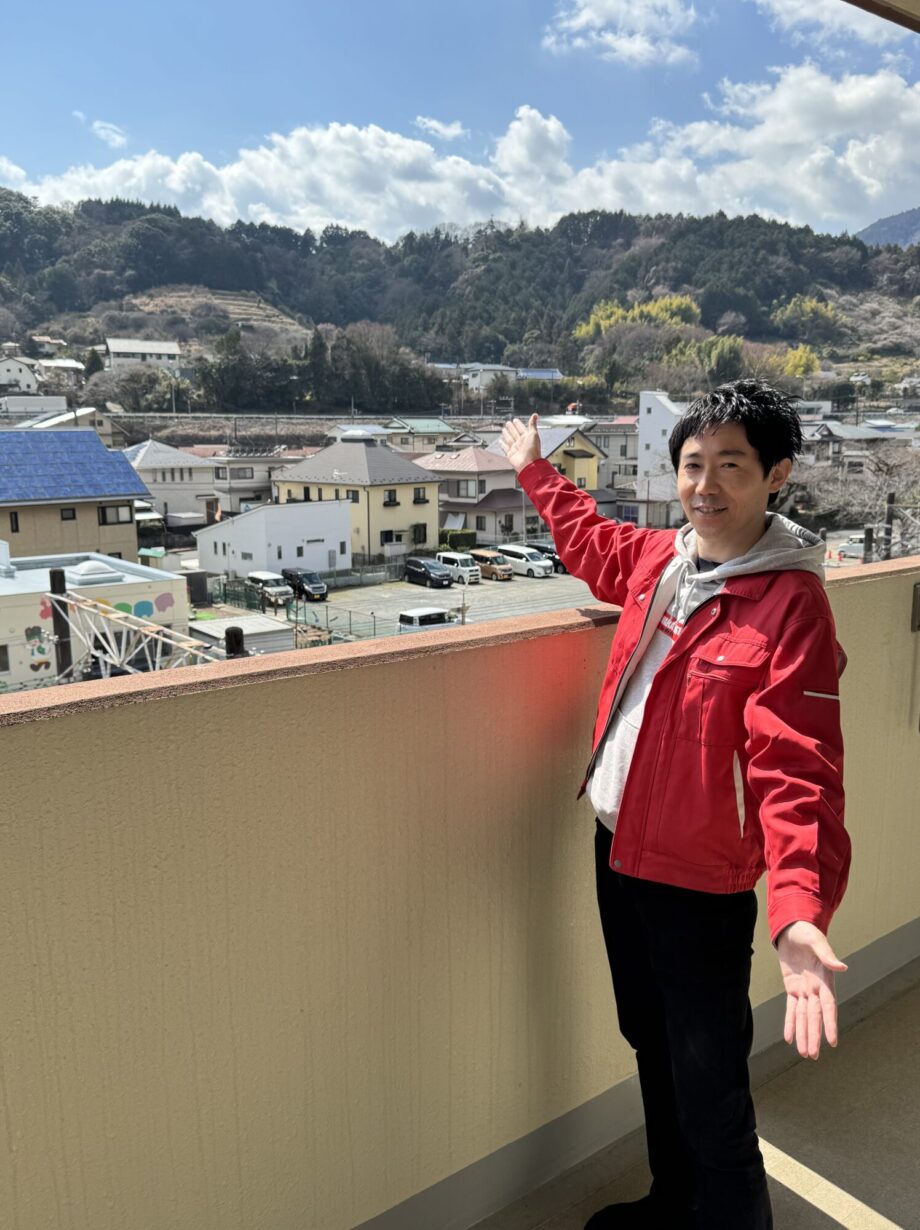 ベランダに出てみると、4階ならではの視線の抜けに感動します。目の前を遮る高い建物がなく、山北の象徴である豊かな山並みがパノラマで広がります。