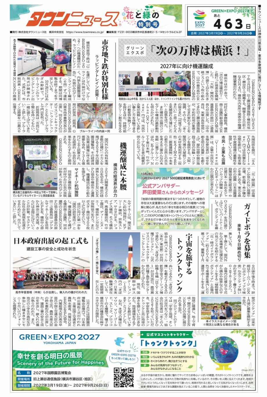 2027年3月19日に開幕する「2027年国際園芸博覧会(GREEN×EXPO 2027)」まであと1年を切りました。地域新聞「タウンニュース中区・西区・南区版」では地元・横浜から国際園芸博覧会を盛り上げるため、「花と緑の特別号」を6月(予定)に発行します。