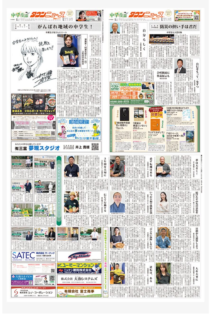 NEW 《大和版》中学生タウンニュース シェアする 地元情報を発信するタウンニュース大和編集室は、「中学生タウンニュース」を創刊しました。中学生が自分の街のことをもっと知り、街のために考え、行動するきっかけになれば幸いです。 2026年4月 デジタルブックはコチラ 創刊号 2025年10月 デジタルブックはコチラ 中学生タウンニュース一覧へ 住所神奈川県大和市 公開日:2026-04-24関連タグこどもタウンニュース シェア ポストする LINEで送る 関連記事こどもタウンニュース 151こどもタウンニュースいせはら版(2026年春号) お米やお食事券などが当たる!こどもタウンニュース 117【読者プレゼント】こどもタウンニュースふじさわ版企画!えのすい招待券などが当たる!こどもタウンニュース 917【読者プレゼント】こどもタウンニュースかわさき市版4月号<ノクティプラザお買い物券などが当たる>こどもタウンニュース 243【読者プレゼント】こどもタウンニュース県西(けんせい)版企画!各種プレゼントが当たります! 人気記事神社・寺・教会 79039「本村神明社(ほんむらしんめいしゃ) 横浜市旭区鎮座」初詣、七五三や人形供養は地元の神社へNEW観光・レジャー・遊び 26572<2026年5月9日>発祥の地でアイスクリームをもらおう!7日~9日はマルシェも@横浜・馬車道住まい・暮らし・生活 15266茅ヶ崎FMで『#ちがすき』を放送中!移住者や様々な分野で活躍中の子どもたちが茅ヶ崎の魅力をお届けします住まい・暮らし・生活 13320【コラム】かいせいな日々。開成町職員が見つけた「田舎モダン」 注目記事NEW住まい・暮らし・生活社協あやせ・No.172【4月号】令和8(2026)年<ふれあいネットワーク「社協」とは、社会福祉協議会を略したものです>NEW取材レポート 27354月更新【タウンニュース連載『花色のパレット』描き方も公開!】水彩画講師・岡田ゆきおさんが紡ぐアートの世界NEW医療【連載54】ちょっと役立つ口腔と歯の話:テーマ「新生活はお口の健康チェックから」横浜市旭区・ふたまたがわ歯科口腔外科NEW観光・レジャー・遊び 26572<2026年5月9日>発祥の地でアイスクリームをもらおう!7日~9日はマルシェも@横浜・馬車道