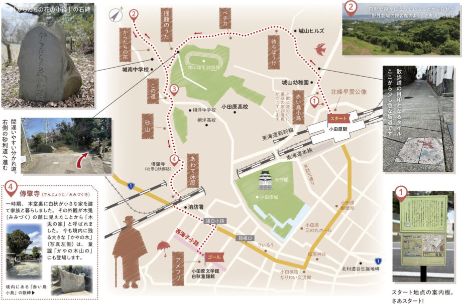 小田原駅から丘陵を越えて白秋童謡館まで約4・5キロ。潮風や緑に包まれ、白秋のまなざしを追体験してください。