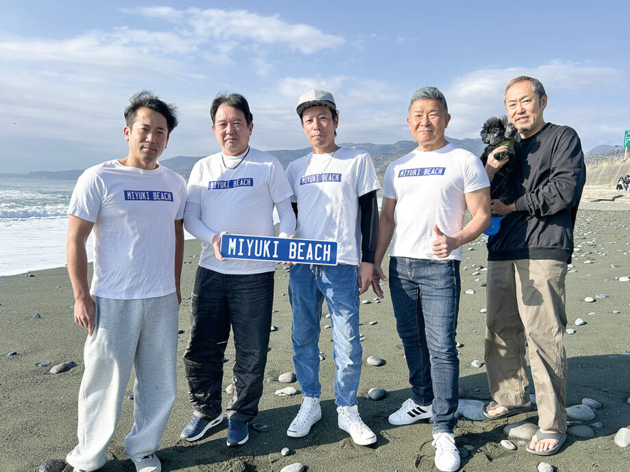 「MIYUKI BEACH」看板の仕掛けのほか、海岸清掃やイベントなどを、地域や仲間と連携して行っている。(左から)芳垣達也さん、藤上孝明さん、土屋貴彦さん、加藤秀一さん、杉崎武彦さん