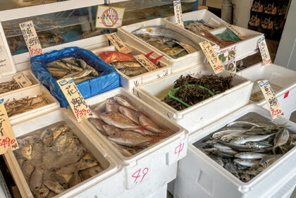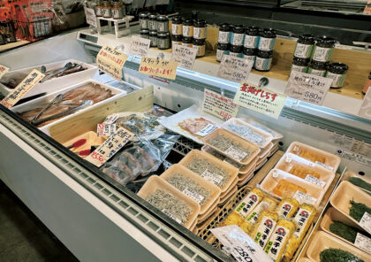 市場直送の新鮮な魚介は、その場で捌いてもらって店内で食べることもできます。お土産用の干物やパックも種類豊富にそろっています