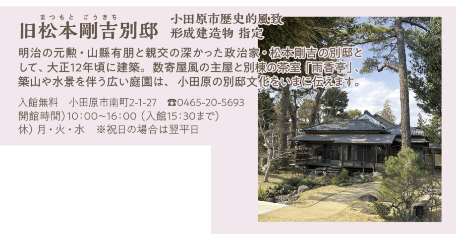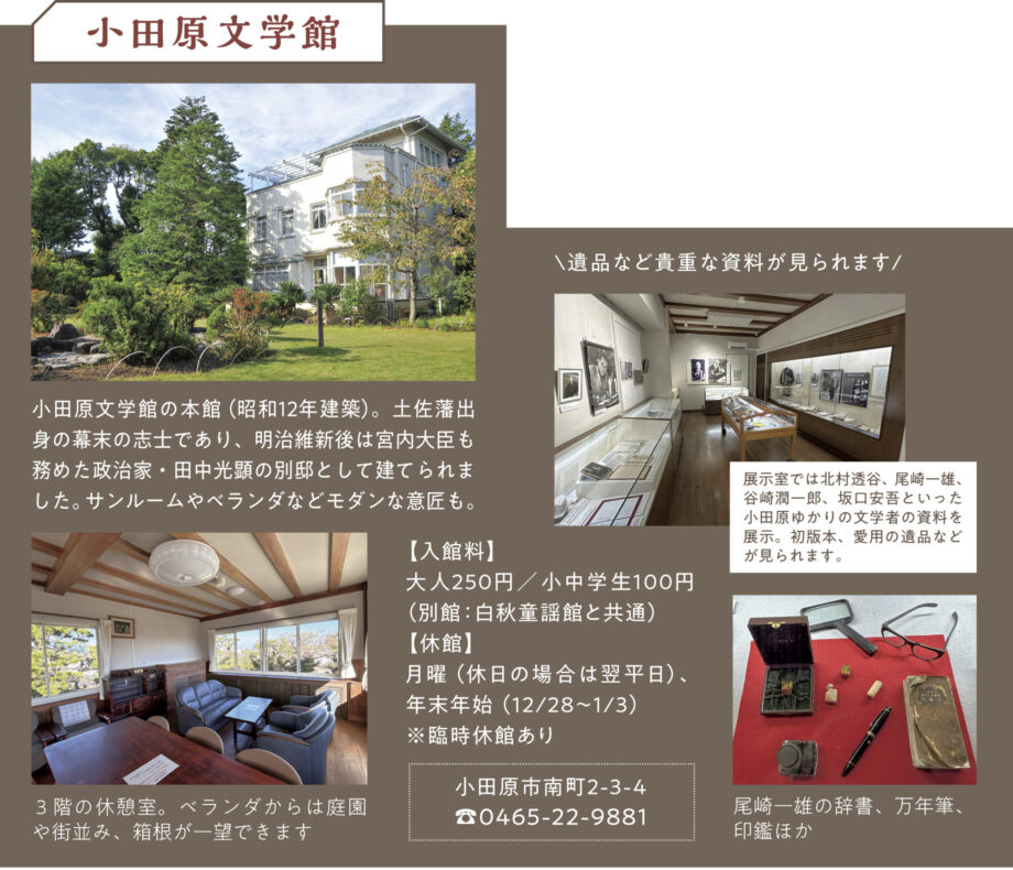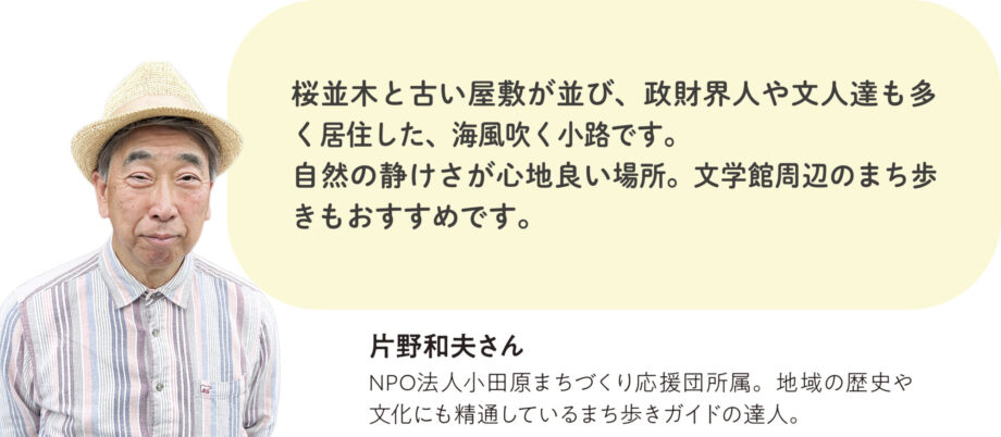 かつて武家屋敷が立ち並び、その後多くの文学者がその風情を愛した西海子小路。春には頭上を覆うほどの桜並木が楽しめます。現代も、大正から昭和初期に建てられた邸宅も見られるエリア。凛とした静寂を湛え、文化の香りが今も息づくこの場所で歴史の余韻を感じてみてはいかがでしょうか。ちょっと足をのばせば、小田原漁港にも。