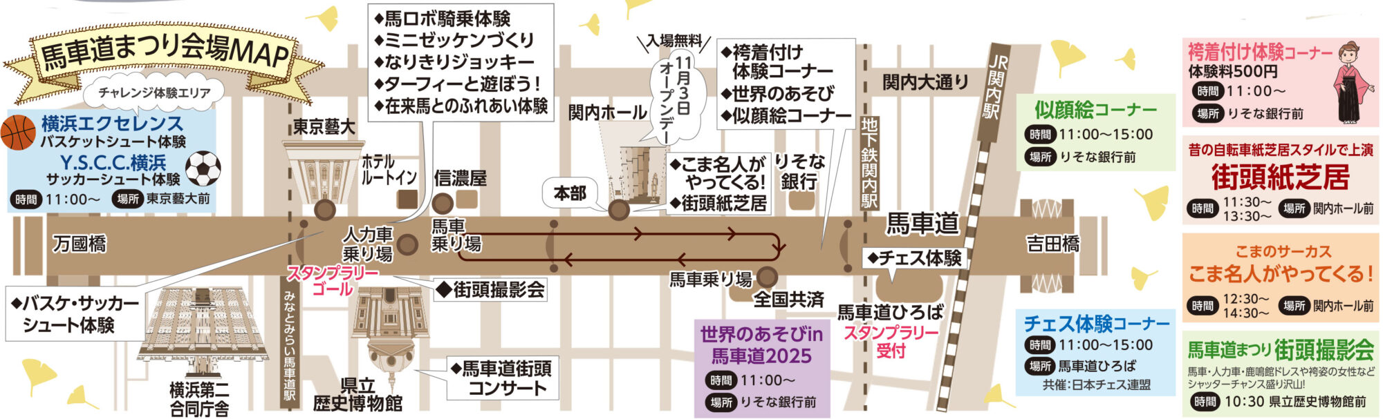 先着1000人に「横濱馬車道あいすもなか」がもらえるスタンプラリー、似顔絵コーナー、巨大なチェス体験、昔ながらの自転車スタイルの紙芝居、街頭撮影会、こま名人による「こまのサーカス」、世界のあそびなど、参加費無料で子どもから大人まで楽しめます。