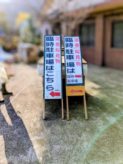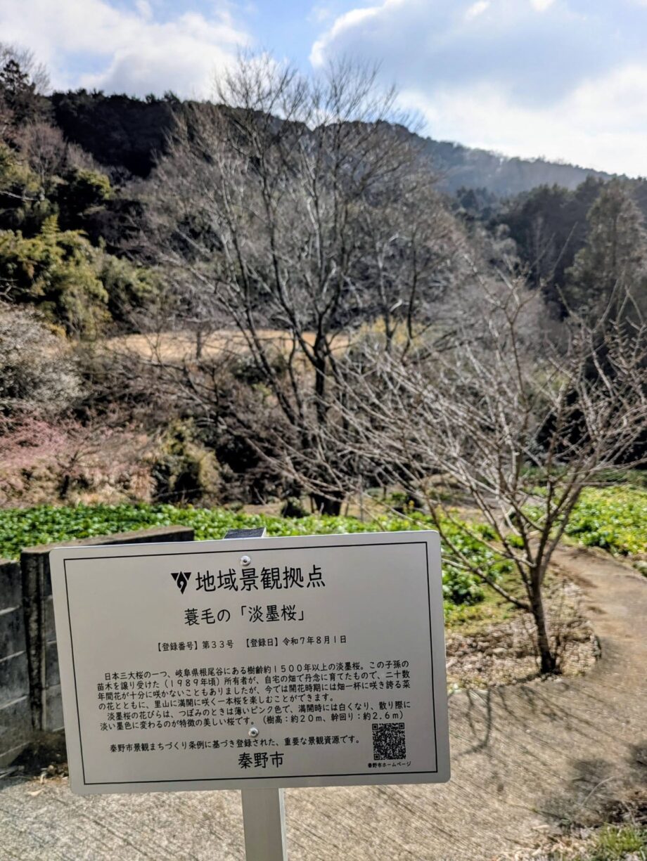 「まだ桜も菜の花も開花の待機中。来月中頃あたりの予定です。市役所で市内の地域景観拠点として認定され、看板はの設置がされました」。