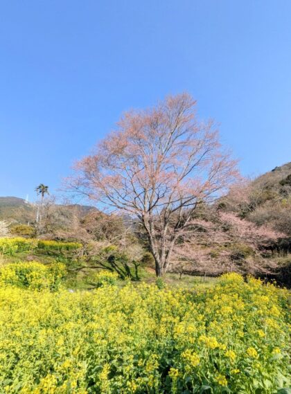19日に開花しましたが、その後の気温が低かったのか開花が進んでいません。今は一分咲きになっていませんが、菜の花は満開で見頃です。良かったらおいでください。