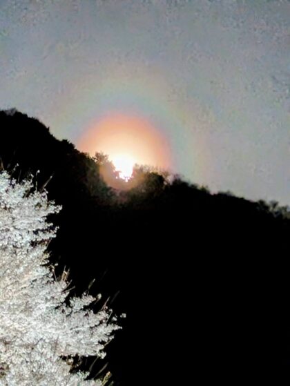 長雨の後の晴れの後の満月になかなか見れない現象が現れました。月暈(げつうん・つきがさ)?月虹?良くわからないけど太陽のハロ現象に似ているような。
