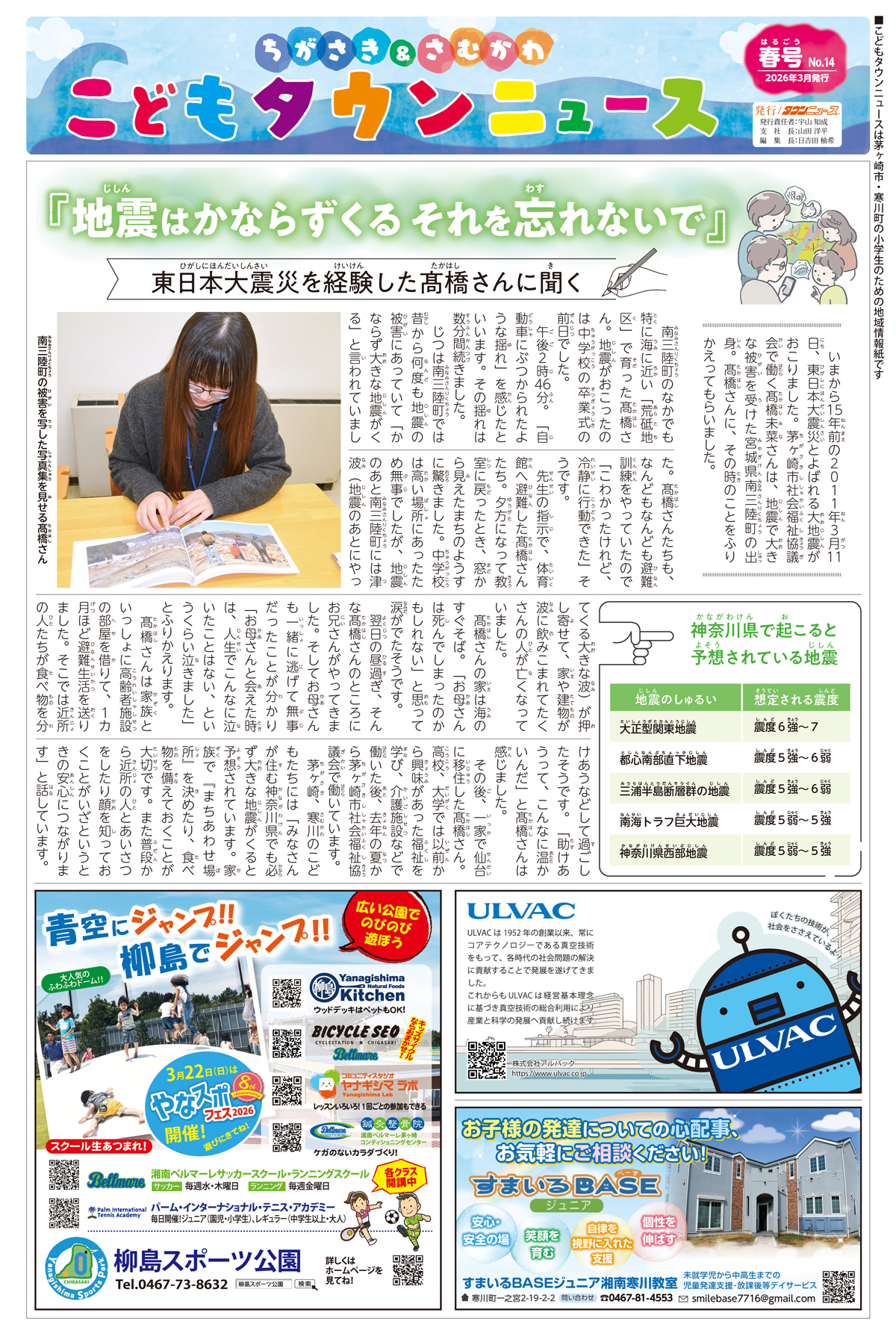 東日本大震災から今年で15年。私たちが学び続けるべき「地震への備え」を特集し、茅ヶ崎や寒川で地震が起きたとき、どんな準備ができるのか、大切な命を守るためのアクションを、子どもたちの目線で分かりやすく解説しています。また寒川町に新しく誕生した「宮山出張所」 では、どんな仕事をしている場所なのか、建物にはどんな工夫があるのかなどの秘密に迫ります!
