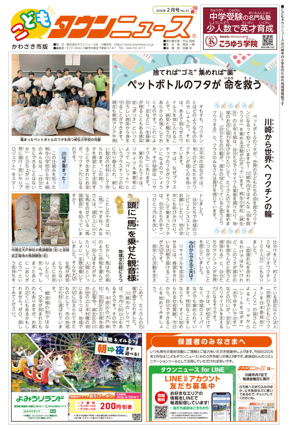 神奈川県全域・東京多摩地域の地域情報紙「タウンニュース」では、川崎市内の公立・私立小学校に配布される「こどもタウンニュースかわさき市版」2026年2月号を発行しました。