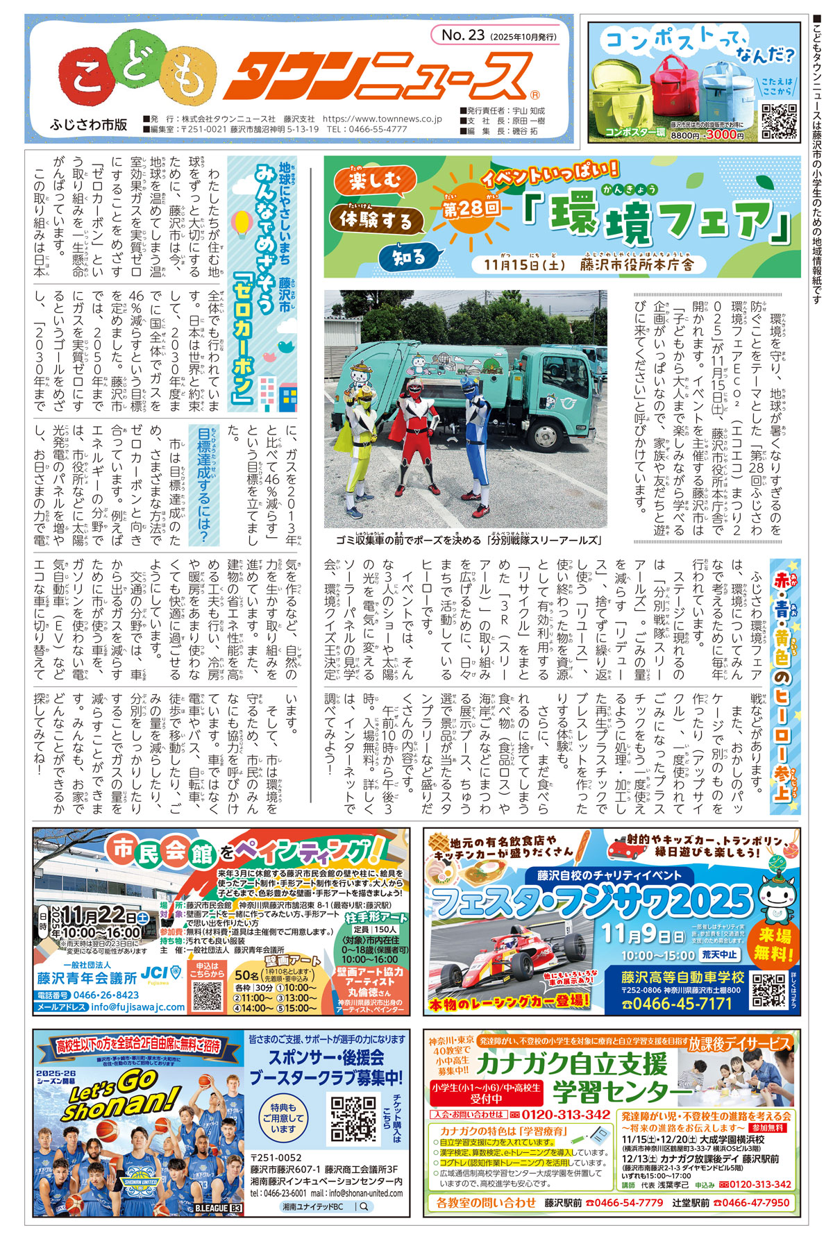 藤沢市内の全公立小学校35校と養護学校1校の全児童に配布する「こどもタウンニュースふじさわ市版」は、2025年10月に第23号を発行しました。