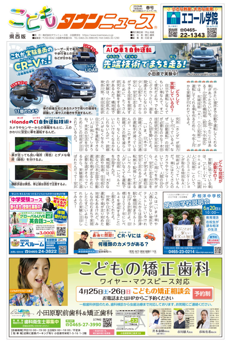 みんなが住む県西2市8町のまちのことをたくさん集めた「こども新聞」。今回は、小田原市の橘地域で行われている自動車自動運転技術の実証実験中様子や「自動運転」や、サッカー高校日本選抜チームのコーチ、KODOMO新聞コンクールで箱町長賞を受賞した小学生などを全力取材!すてきな読者プレゼントも用意しているので読んでみてね!