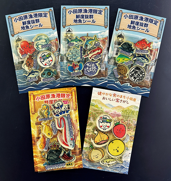 アクリル仕上げのオリジナルシール。相模湾でとれる魚の「地魚シール」と、かわいい野菜・果物の「健やかな食まち小田原シール」。非売品のレアグッズですよ。※種類は選べません