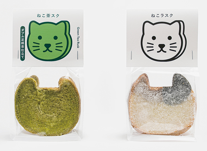 ほっこり愛らしいねこ型のラスク。障害者福祉施設のメンバーが丁寧に焼き上げた手作りです。三毛猫みたいな「ねこラスク」とダブル足柄茶仕立ての「ねこ茶スク」をセットで。