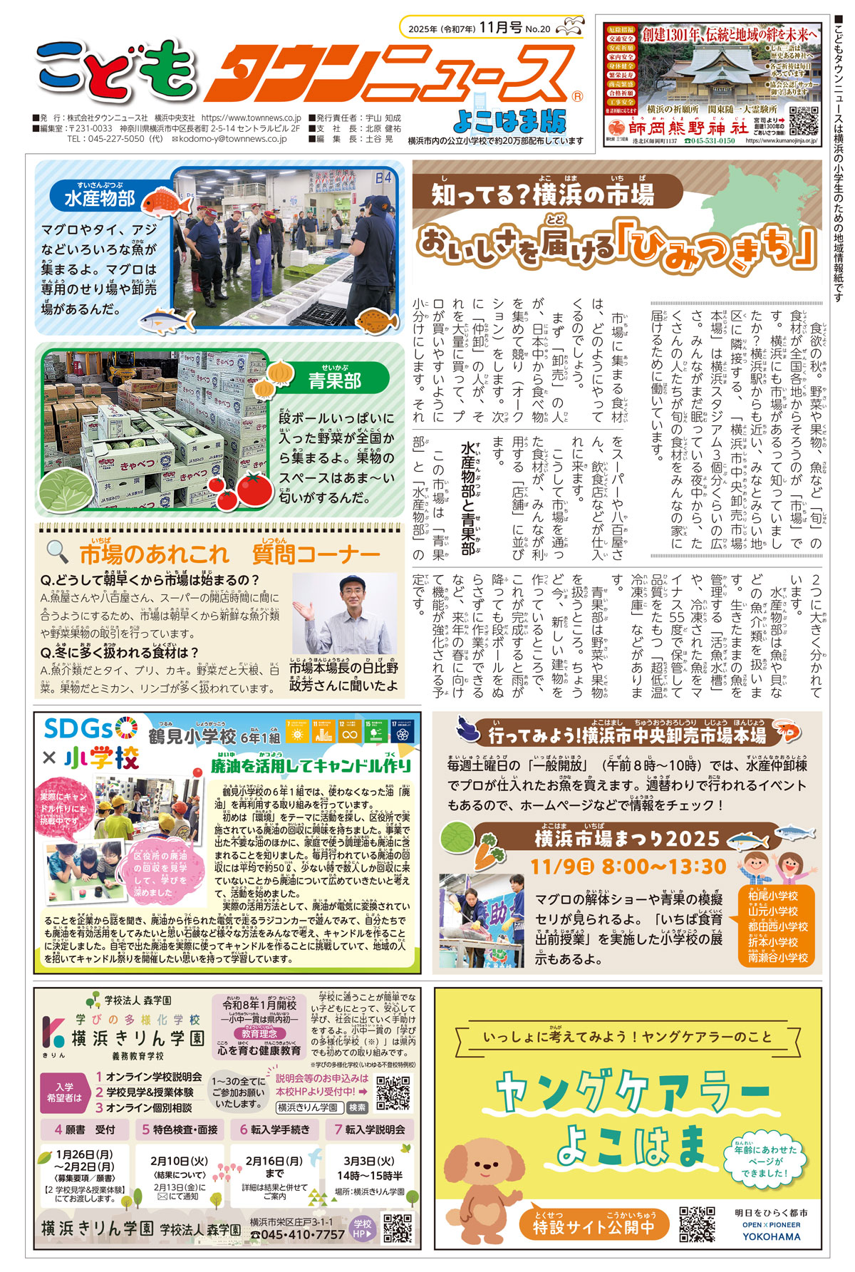 「こどもタウンニュースよこはま版」2025年11月号を発行しました。本紙は横浜市内の全公立小学校に約20万部を配布しています。子どもたちに新聞や活字に親しむ機会を持ってもらうとともに、地元「横浜」のことを知り、好きになってもらうのが目的です。