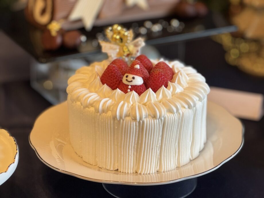 王道のショートケーキは、きめ細やかで軽い口どけの生クリームがたっぷり使用されています。しっとり焼き上げたスポンジにたっぷりの苺がサンドされ、これまたたっぷりの生クリームが美しく絞られ、パティシエの技とこだわりがうかがえます。ちょこんと顔を出す苺のミニサンタの表情にも癒されます。