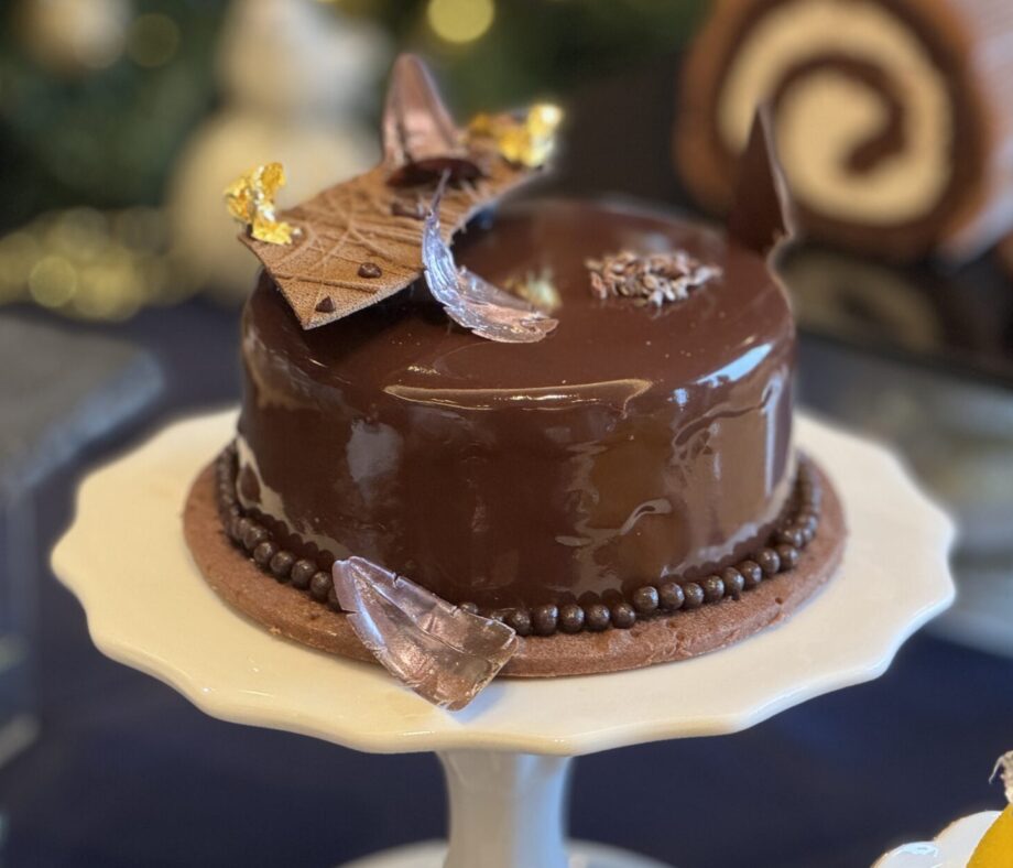 濃厚なチョコレートの中にはピスタチオのムースやベリージャムが。甘酸っぱさとほろ苦さが溶けあった、大人のクリスマスを味わうことが出来るケーキです。