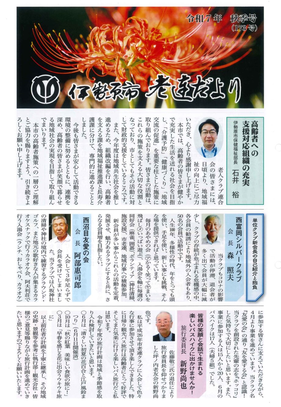 「伊勢原市老人クラブ連合会」の公式ホームページです。高齢者の仲間づくりや健康づくり、生きがい向上を目指し活動しています。グラウンドゴルフ大会、健康・文化教養講座、老人福祉大学、バスハイクなどを実施しています。ここでは、連合会からの最新情報や活動報告、イベント情報などを随時発信していきます。