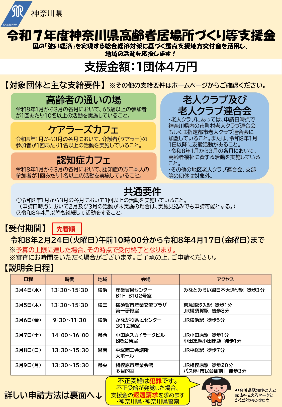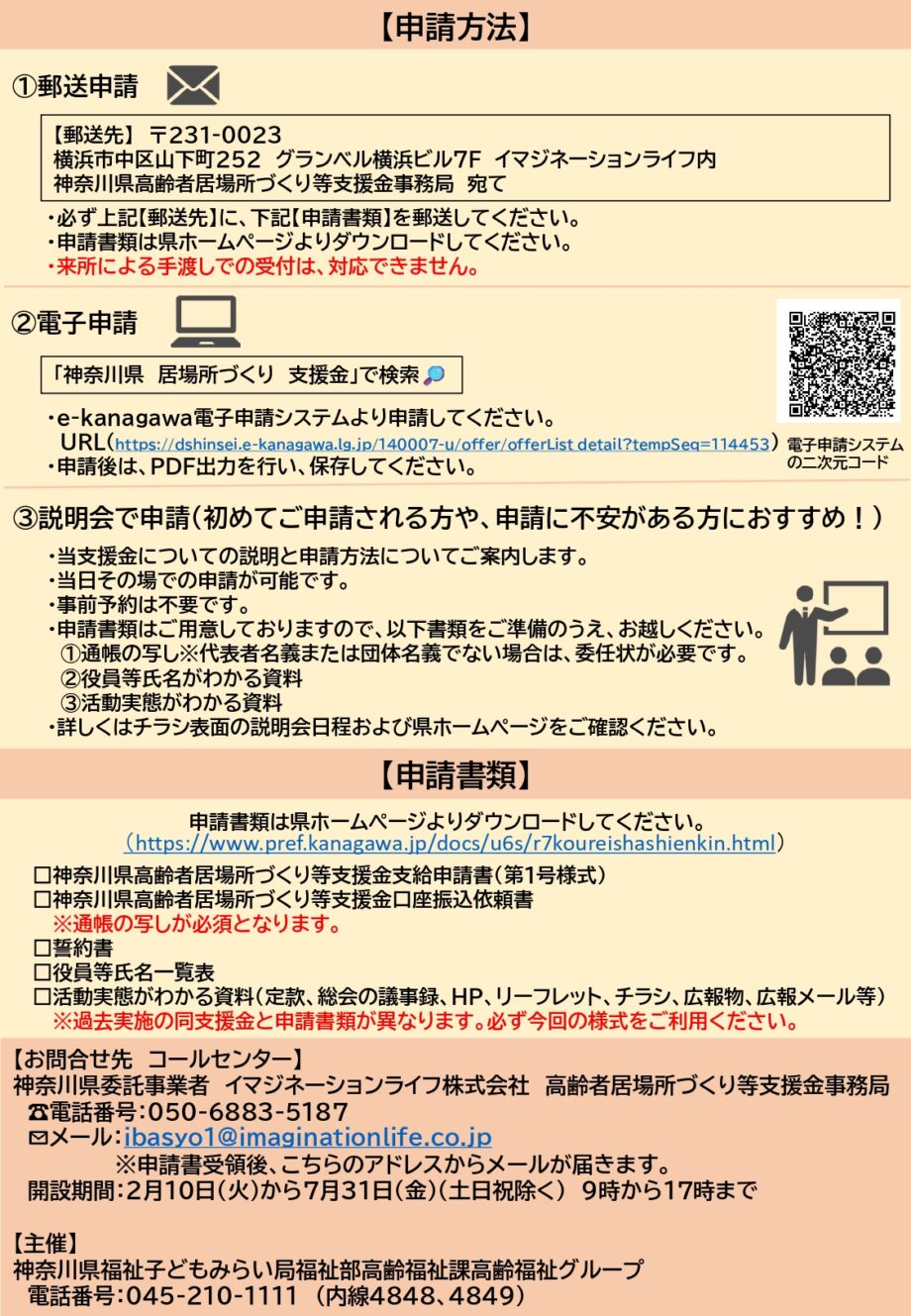 ■ どんな制度? 令和8年1月~3月に月1回以上活動している「通いの場」「カフェ」「老人クラブ」等に、4万円を支給します。 ■ 受付期間 令和8年2月24日(火)10:00 ~ 4月17日(金) ※予算の上限に達した時点で受付終了となります。 ■ 申請が不安な方は… 3月4日~9日に、横浜・横須賀・小田原・平塚・相模原で「申請サポート付き説明会」を開催します。 予約不要で、通帳の写し等を持参すればその場で申請可能です。 ▼ 詳しくはこちら 検索:「神奈川県 居場所づくり 支援金」電話:050-6883-5187(平日9~17時) https://www.pref.kanagawa.jp/docs/u6s/r7koureishashienkin.html#shinseisyorui
