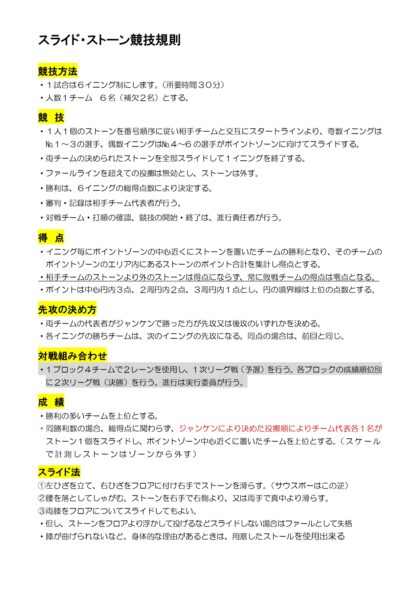 ●NHKとテレビ朝日で取り上げられ、全国から“漬物石”を使った「スライドストーン」への反響をいただいております。【競技規則】と【コートレイアウト】資料をご紹介いたしますので、ぜひ参考になさってみてください。(2026/01/08更新)
