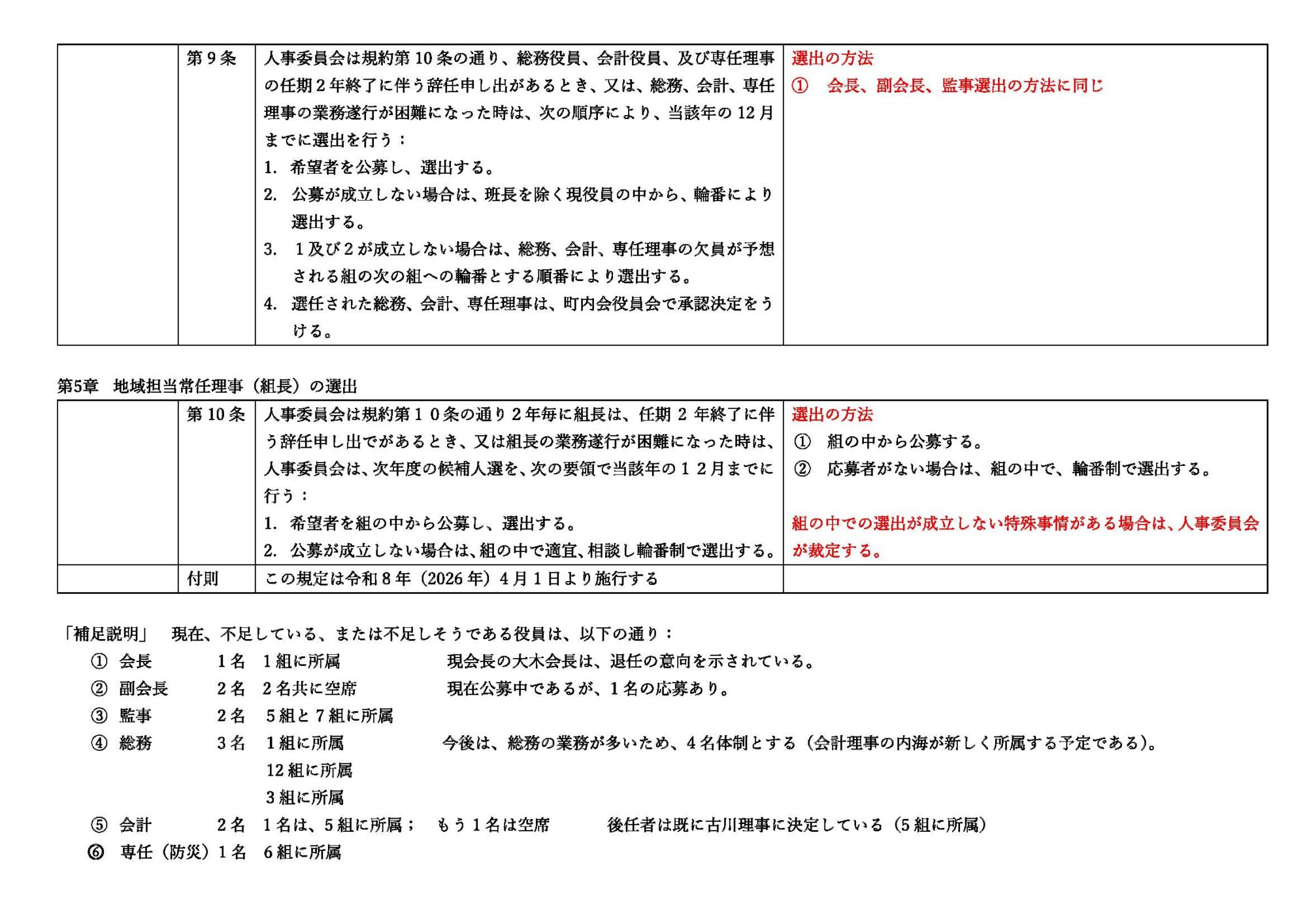 10年に渡って下郷町内会の繁栄に尽くされた大木会長が、健康状態不良により、来年3月末で退任したいとの意向を示されました。上記項目3の役員人事規定の実施を急ぎます。