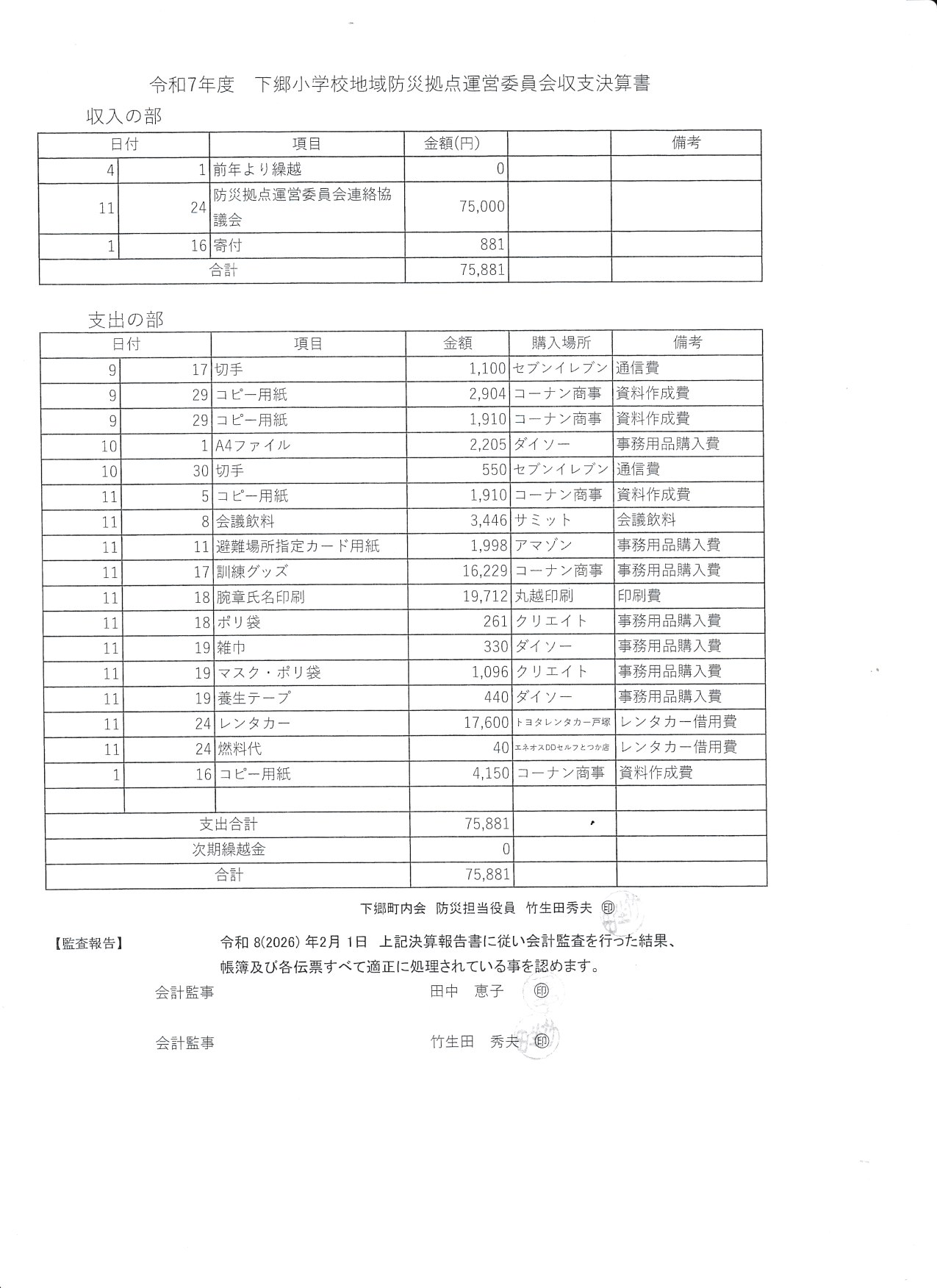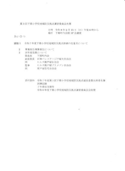 4.2025 年度の下郷小学校地域防災拠点訓練の反省会、年間の事業報告と決算報告、来年度の新役員紹介(添付資料1-2)