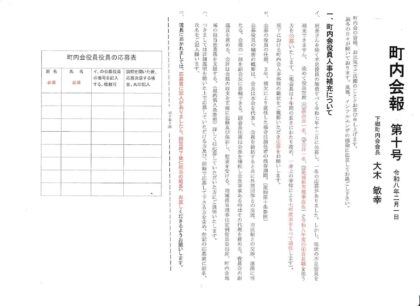 ① 町内会報第10号が、近々皆様に回覧されます。内容は、「町内会役員補充のための公募」です。