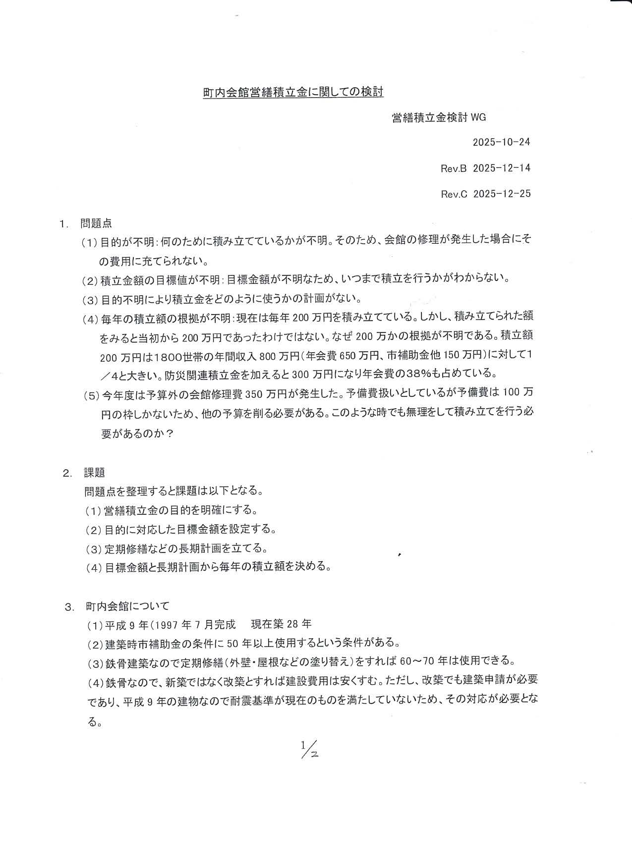 ① 過去数十年に渡って「会館営繕積立金」として、町内会費の一部を積み立ててきました。しかし2025年度に会館の大規模な補修(雨漏り補修:約350万円)をするにあたり、積立金を使うべきか、一般会計の予備費を使うべきか、結論が出ないまま一般会計の予備費を使いました(本件は、昨年9月度後半部のホームページで報告済)。