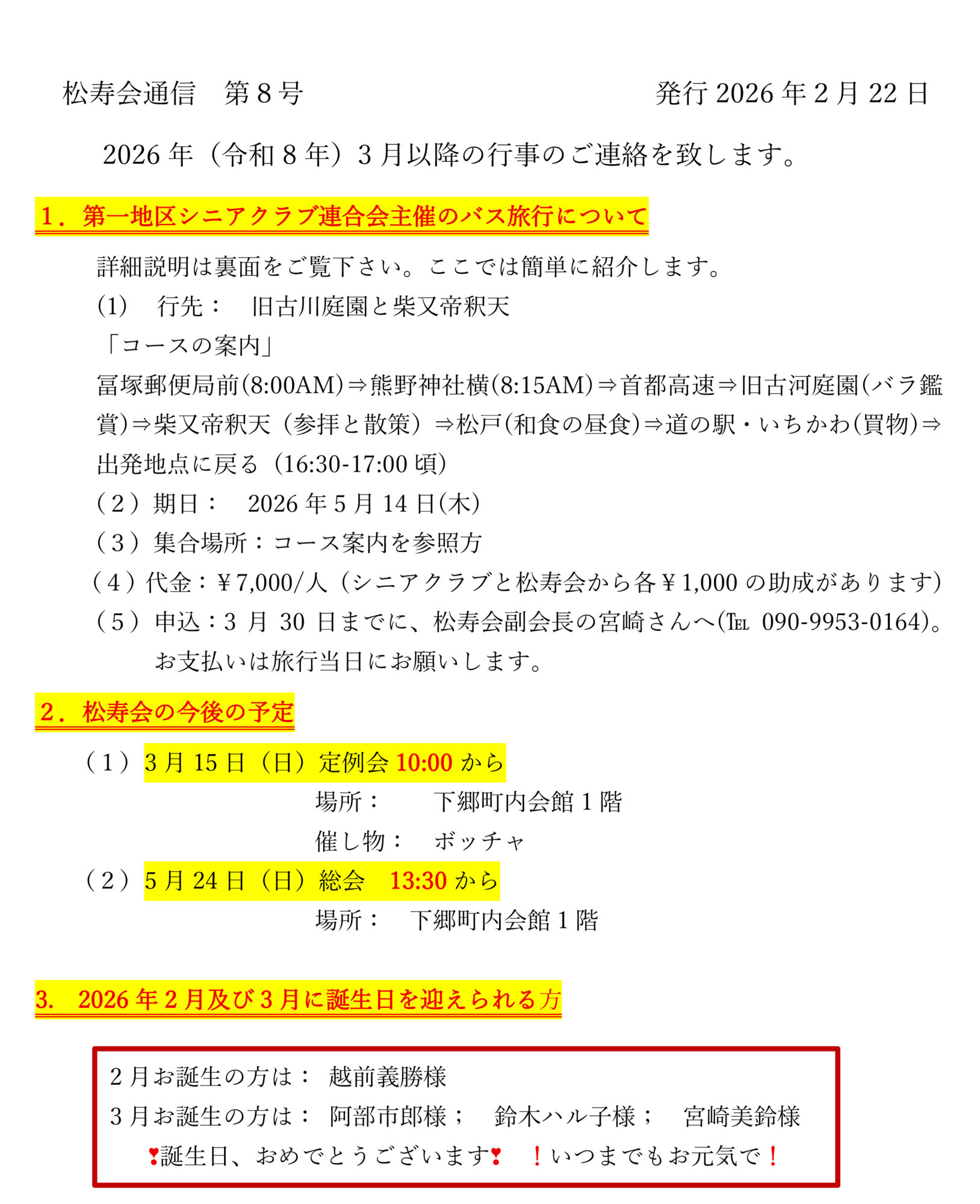 松寿会通信 第8 号が発行されましたので、お知らせ致します。5 月のバス旅行のお知らせ、松寿会の今後の行事のお知らせ、及び2 月・3 月に誕生日をお迎えになる方の紹介です。詳細は添付資料3-4 をご覧下さい。
