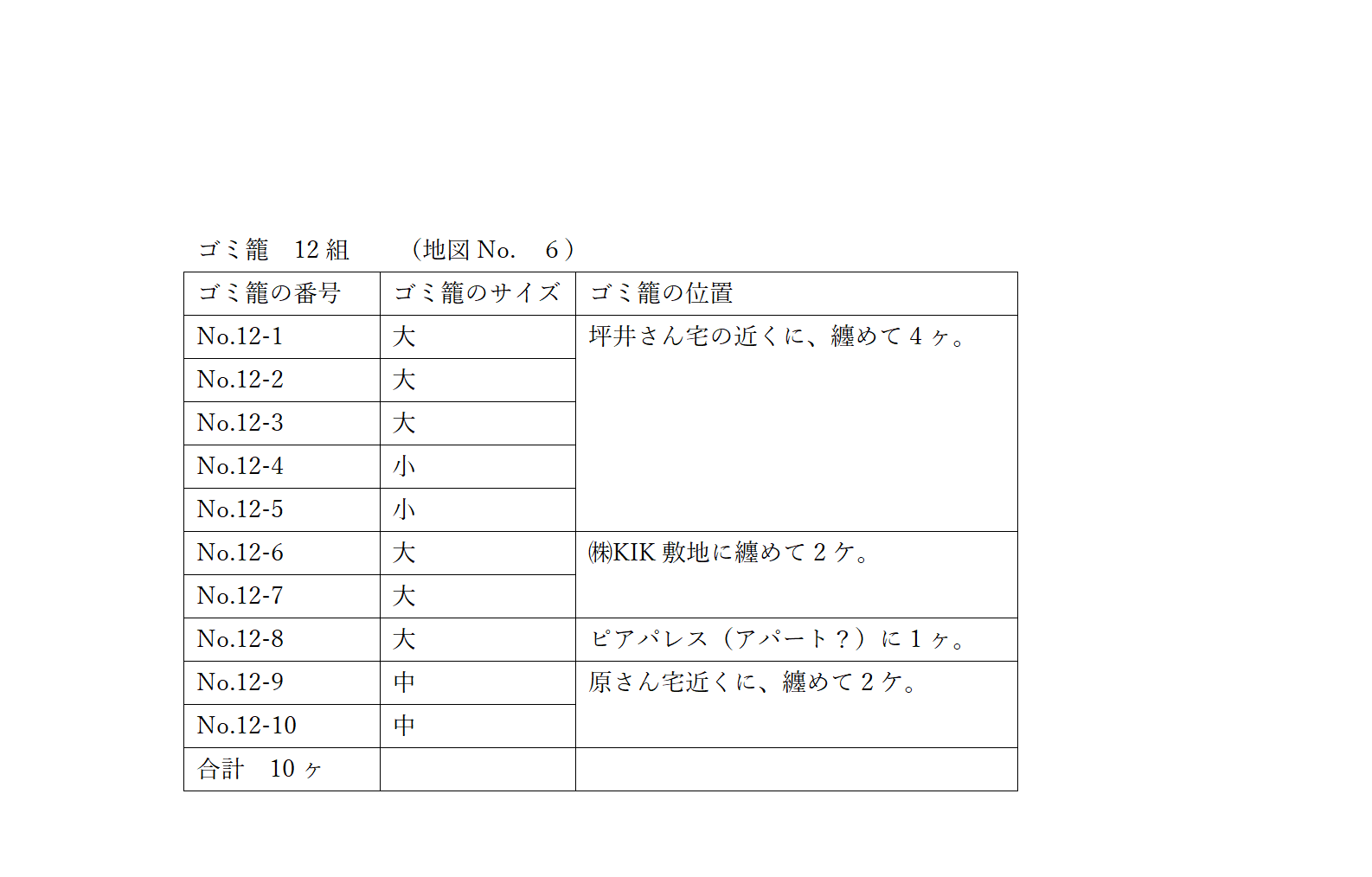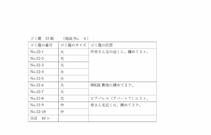 ③ 第12組のゴミ籠数は、10ヶでした。添付資料9-10をご参照ください。