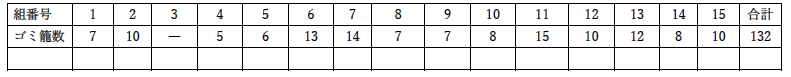 ⑩ 尚、全15 組中3 組からは報告がありませんでした。全14 組の「ゴミ籠数合計は132 ヶ」です。