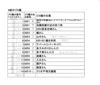 ④ 第5組のゴミ籠数は、6ヶでした。添付資料7・8をご参照ください。