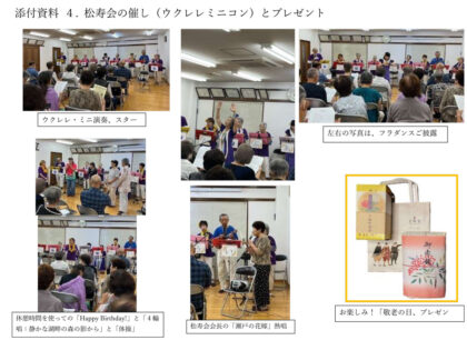③ 松寿会でも、メンバー全員へお祝いが贈られました(添付資料4)、更にウクレレ・ミニ・コンサートが開催されて、松寿会メンバー以外の方のご参加も得て、大変盛り上がりました。その模様を写真で紹介致します(添付資料4)。